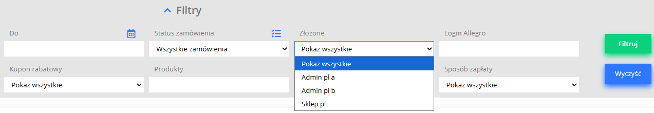 Dodaliśmy wybór „admina” w polu złożone – w filtrach zamówień.